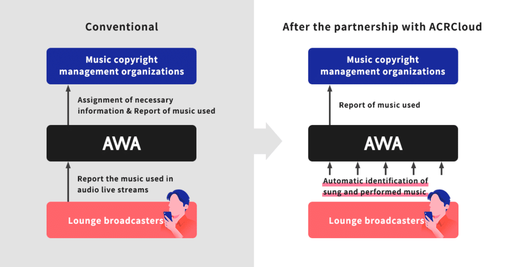 The technology used for automatic music identification is provided by ACRCloud, known as Cover Song Identification. This solution analyzes archived audio data from AWA Lounge audio live streams to identify the music used.